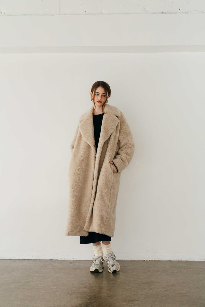 希少なウール Super140s をパイル部分に贅沢に使用した、ウールボアのロングコート。